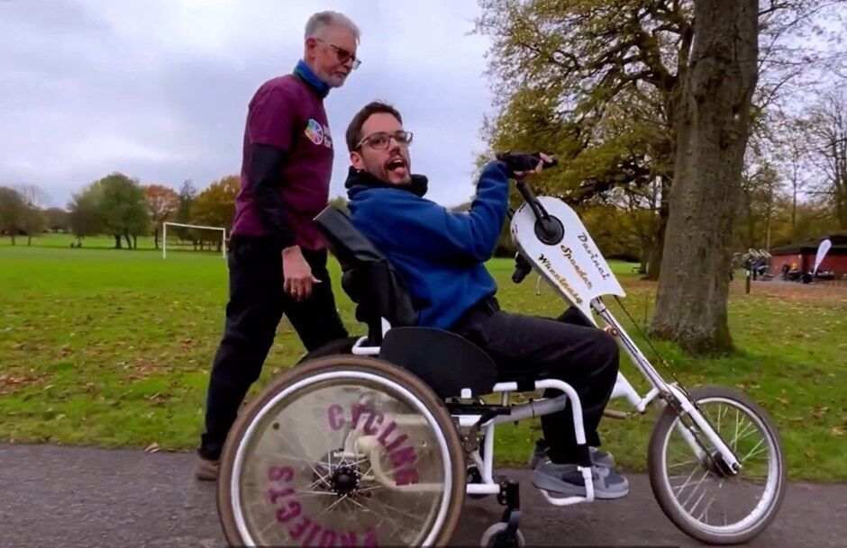 When Keith and Chris first arrived at Wheels for All, Chris required significant support to enjoy cycling. Together with our team, Keith helped him progress from a wheelchair-access cycle to a double hand cycle, and now to riding independently on a single hand cycle.